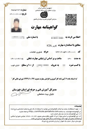 برخی از موسسات معتبر همانند سازمان مدیریت صنعتی یا همان سازمان فنی و حرفهای در پایان دورههای مهارتها به دانش آموختگان مدرک پایان دوره یا گواهینامه معتبر اهدا مینمایند. دریافت ICDL فنی و حرفهای نیز از این قاعده مستثنی نمیباشد و متقاضیان دریافت این مدرک پس از ثبت نام و گذراندن دورههای مربوط به آن و کسب حد نصاب نمره قبولی در آزمون عملی مدرک معتبر پایان دوره ICDL را دریافت مینمایند. سازمان فنی و حرفهای کشور یکی از معتبرترین مراکز ارائه مدرک مهارتها بوده است و در سالهای اخیر بخشی را راه اندازی نموده که متقاضیان بدون شرکت در دورهها و تنها با شرکت کردن در آزمون عملی مربوط به هرکدام از مدرکها و دورهها، مدرک پایان دوره را دریافت نمایند. بنابراین متقاضیان مدرک ICDL فنی و حرفهای با شرکت کردن در این آزمون میتوانند بدون شرکت در دوره، معتبرترین مدرک را با کسب حد نصاب نمره در آزمون دریافت نمایند. حدنصاب پنجاه درصد نمره از صد در صد در آزمون کتبی وکسب هفتاد درصد نمره در آزمون عملی برای قبولی در آزمون دریافت مدرک ICDL کافی میباشد و میتوانید مدرک ICDL را دریافت نمایید.