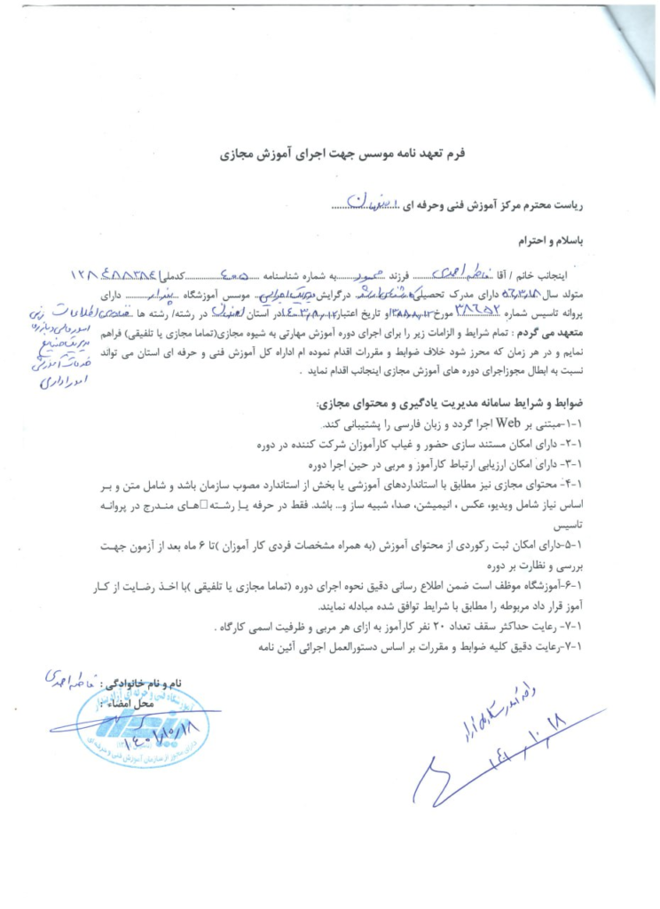 - كارآموز موظف به رعايت ضوابط ومقررات آموزشي و انضباطي آموزشگاه كه منطبق با دستورالعمل اجرايي آيين نامه نحوه ي تشكيل و اداره آموزشگاه هاي فني وحرفه اي آزاد مصوب هيات نظارت مي باشد.(ضوابط ومقررات مذكور به همراه نسخه قرارداد تحويل مي گردد)